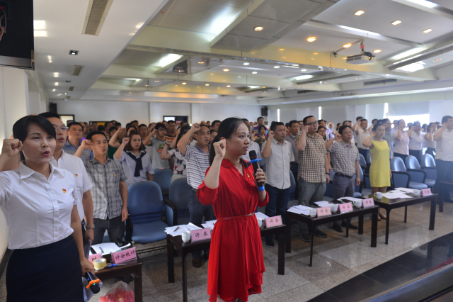 “我志愿加入中国共产党,拥护党的纲领,遵守党的章程……”,演讲比赛开始之前,局机关党委副书记谭超同志在鲜红的党旗下高举右手,带领全体党员庄严宣读誓词。