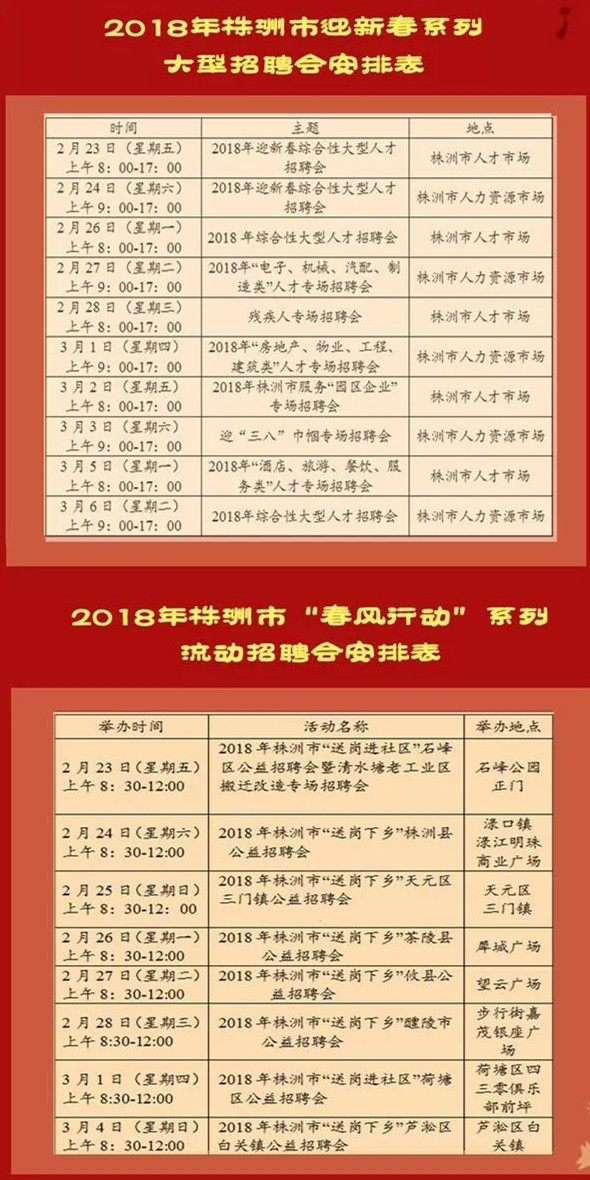 2018年2月23日(农历正月初八)起,我市将连续举办10场“2018年株洲市迎新春系列大型招聘会”和8场2018年株洲市“春风行动”系列流动招聘会,诚邀广大用人单位和求职者届时参会。