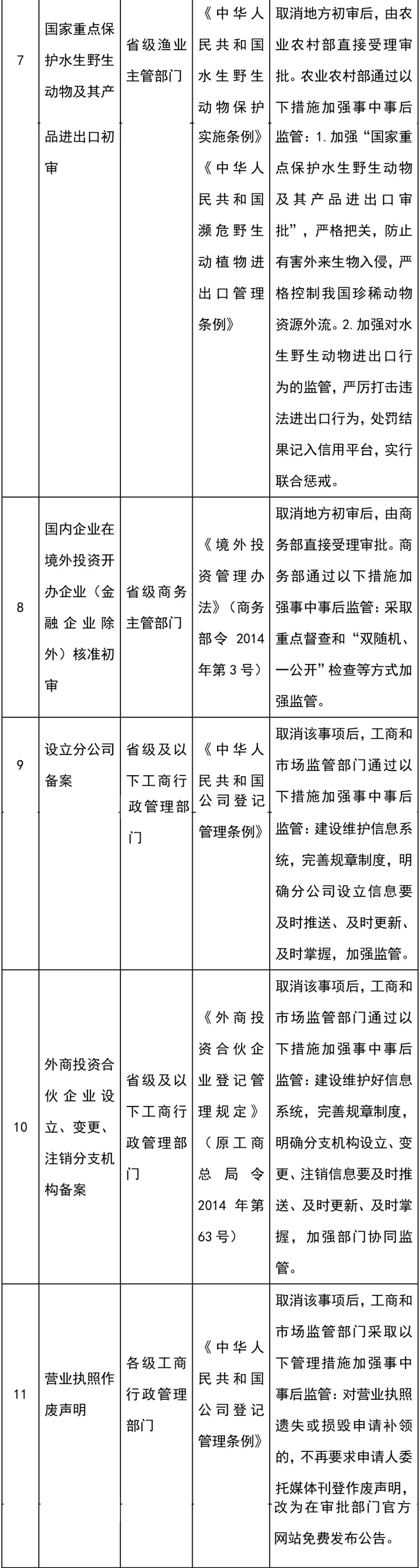 经研究论证,国务院决定取消11项行政许可等事项,现予公布。另有6项依据有关法律设定的行政许可事项,国务院将依照法定程序提请全国人民代表大会常务委员会修订相关法律规定。对取消的行政许可等事项,相关部门要制定完善事中事后监管细则,自本决定发布之日起20个工作日内按规定向社会公布,并加强宣传解读、确保落实到位。