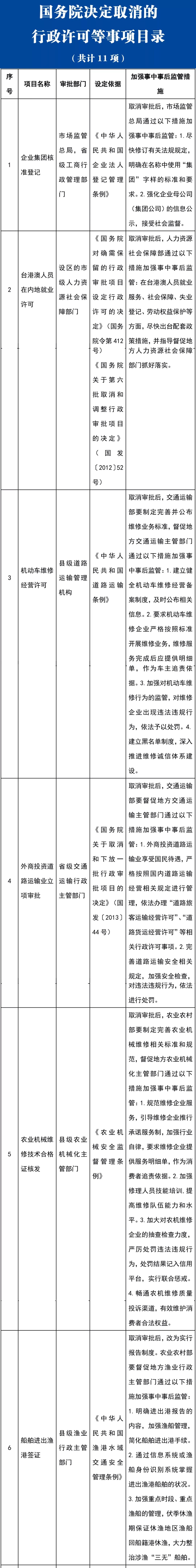 近日,国务院印发《关于取消一批行政许可等事项的决定》,决定取消11项行政许可,包括企业集团核准登记、台港澳人员在内地就业许可、营业执照作废声明等。