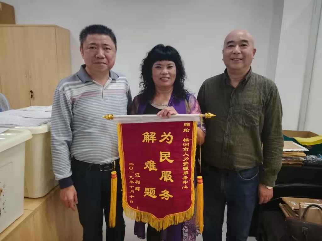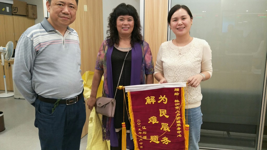10月14号下午,来自广州的江女士,激动地将一面写着“为民服务解难题”的鲜红锦旗,送到了市民中心人力资源服务中心窗口,感谢这里的工作人员,终于解决了她退休的难题。