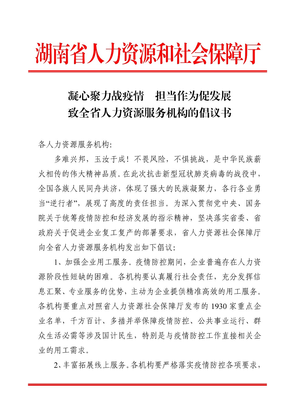 致全省人力资源服务机构的倡议书
