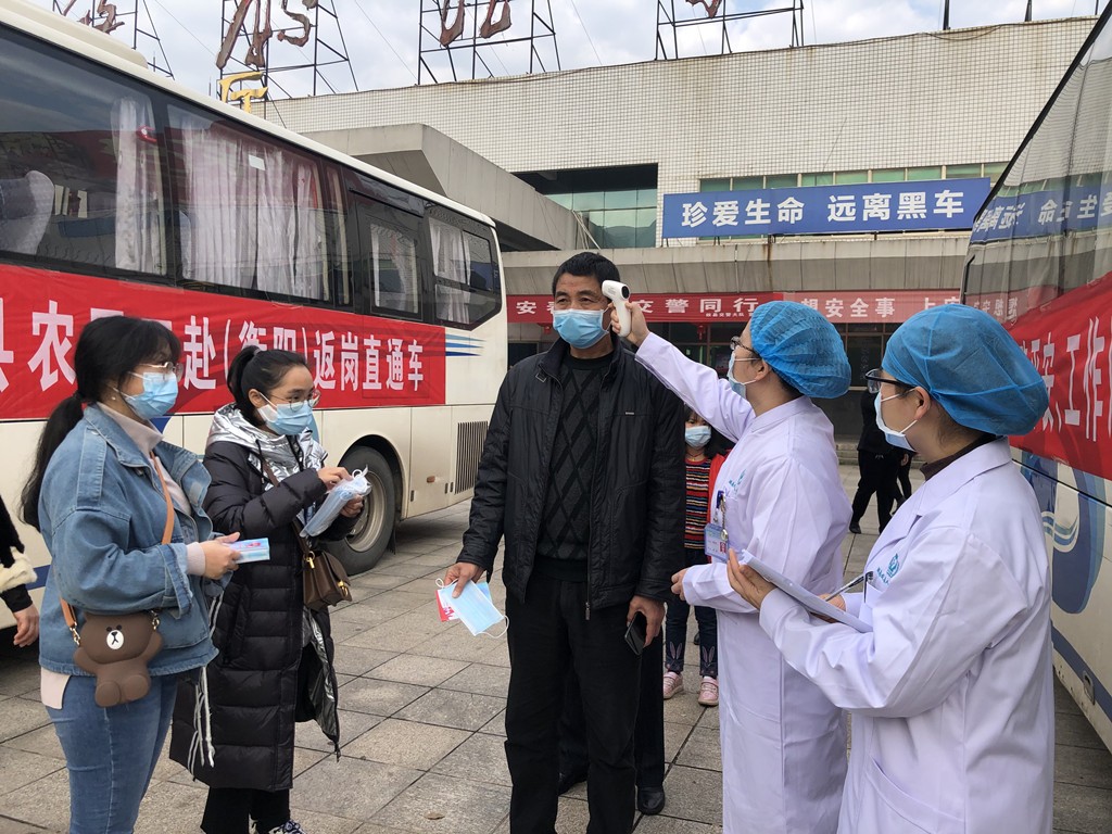 组织员工返岗复工,不能单靠人社部门“唱戏”。为此,全市卫健部门严格按照疫情防控要求,对输送返岗人员车辆提前进行严格的安全例检及防疫消毒,为返岗人员讲解疫情防控知识,并为他们配备必要的防护用品;上车前,交通部门对每一位返岗人员进行实名信息登记,采取隔座乘车。为应对紧急情况,车后排也预留出了相应的隔离空间。