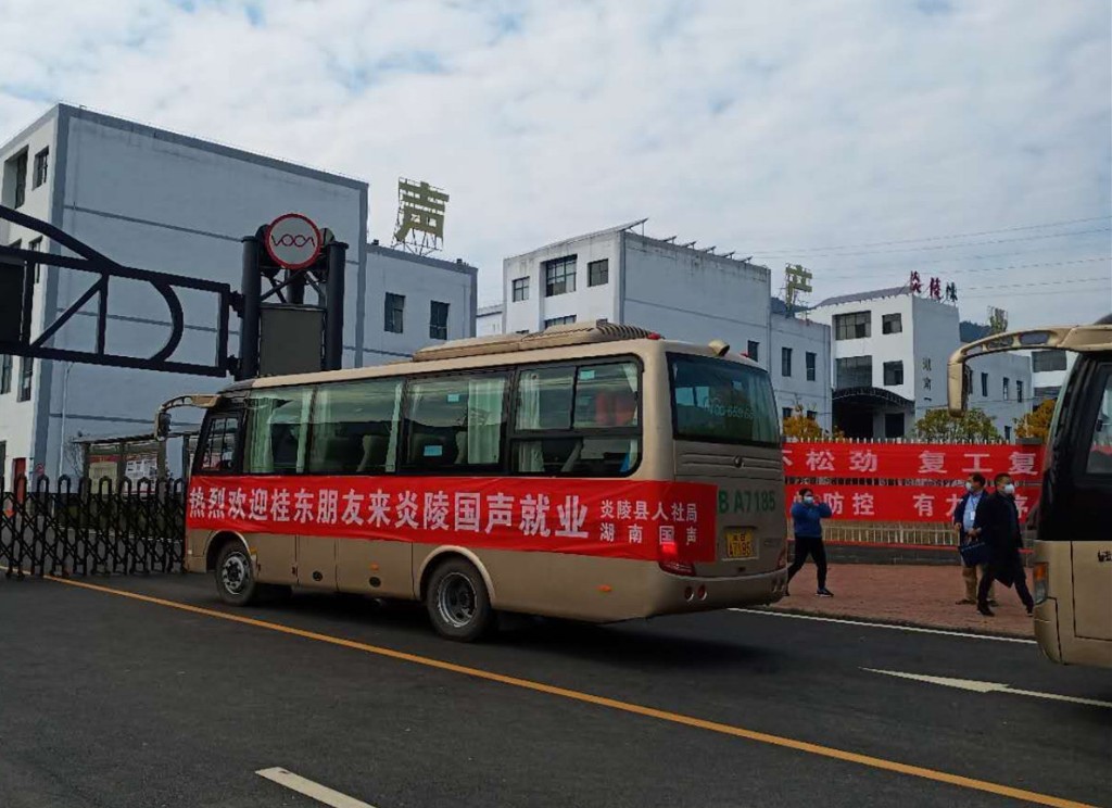 2月23日,桂东县就业服务市场门口分外热闹,两台贴有"热烈欢迎桂东朋友来炎陵国声就业""祝桂东县返岗人员一路顺风、工作顺利"标语的大巴车旁围满了携带大包小包的人群,炎陵县为企业复产安排专车到桂东县迎接48名劳动者到湖南国声声学科技股份有限公司就业,正式开启了炎陵县企业复产跨区域迎接员工上岗的序幕。