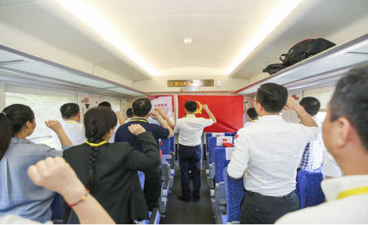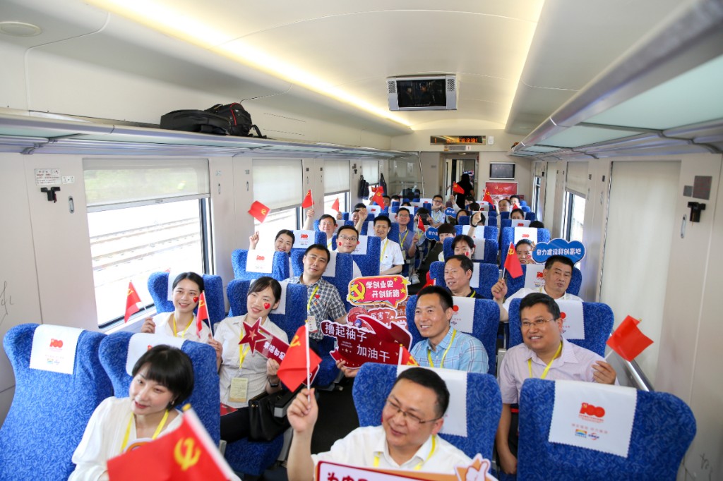 “我志愿加入中国共产党,拥护党的纲领,遵守党的章程,履行党员义务……”洪亮的口号声回荡在红色车厢,这是市人社局党员干部在重温入党誓词。“车厢”课程内容丰富,在“红色主持人”“红色播音员”的带领下,180多名党员干部学唱红歌、参与党史抢答、观看党课党史视频、讲述湘东红色故事,嚼着红米饭、体验红军餐。市人社局围绕党史学习教育“学史崇德”主题,在红色专列上组织开展“七个一”系列红色主题活动。党员们通过发朋友圈、微信群聊、写留言等形式,分享了此次活动的感悟体会。