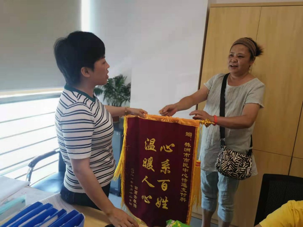 “非常感谢,感谢您热心帮我解决困难,救了我一命!”2021年7月12日上午,市民田女士来到株洲市市民中心,将一面写有“心系百姓,温暖人心”的锦旗送到市社会保险服务中心待遇支付科科长刘婵手中并真诚致谢。