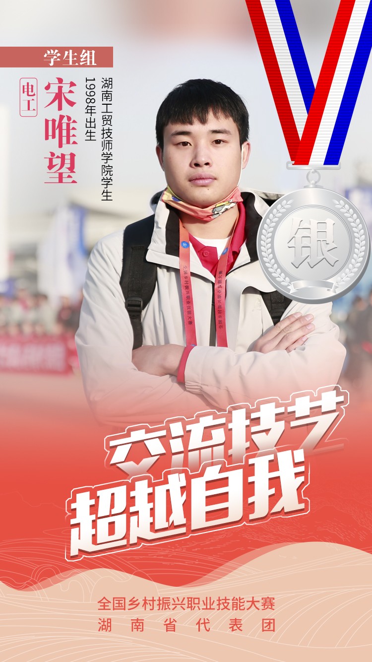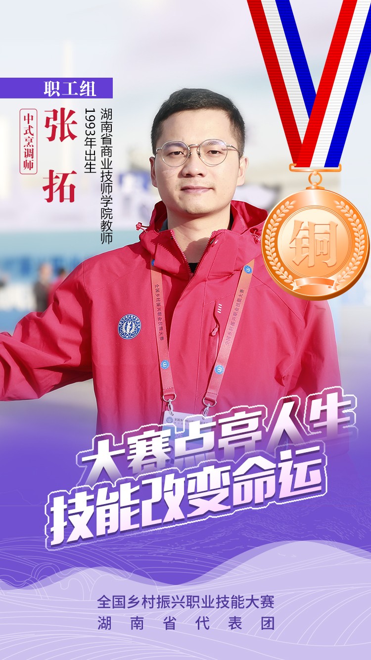 市人社局相关负责人介绍,三天里,来自全国28个省份和新疆生产建设兵团的640多名选手在决赛比武竞技,展示了新时代乡村技能人才的精湛技艺和良好风貌。我市选派了5名选手代表湖南省参赛,湖南工贸技师学院的学生宋唯望获得电工第二名(银牌);湖南省商业技师学院教师张拓获得中式烹调师第四名(铜牌),这也是我市在全国性职业技能竞赛中取得的又一优异成绩。