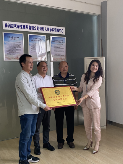 随后,潘庆一行前往株洲市紫气东来商贸有限公司进行调研,并向该企业颁授“湖南省劳动人事争议金牌调解组织”奖牌。截至目前,我市已有株洲紫气东来商贸有限公司、湖南红海人力资源有限公司株洲分公司、株洲易利达机电有限公司3家企业获此殊荣。潘庆对企业获得的荣誉表示祝贺,他希望企业再接再厉,以荣获金牌劳动人事争议调解组织为契机,进一步发挥劳动人事争议调解组织在劳动争议预防调解中的预防前沿阵地和调解战斗堡垒作用,不断提高调解仲裁工作质效和公共服务能力,为株洲经济社会高质量发展提供稳定和谐的劳动用工环境。