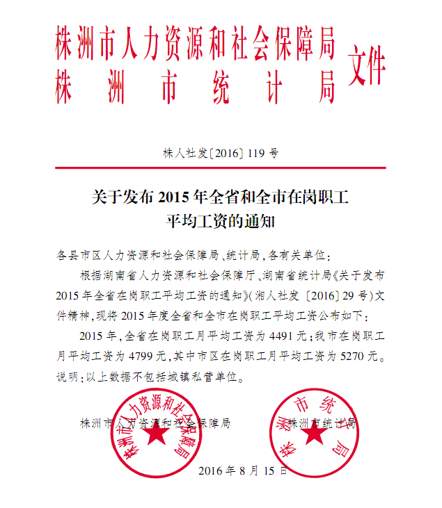 关于发布2015年全省和全市在岗职工平均工资的通知