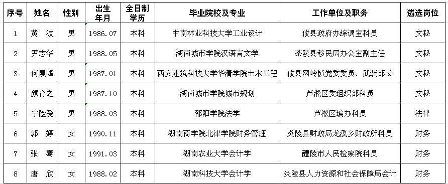 根据《2016年株洲市人力资源和社会保障局公开遴选工作人员公告》要求,经笔试、面试、体检、考察、研究讨论等程序,确定黄波等8名同志为拟转任人选,现予以公示:
