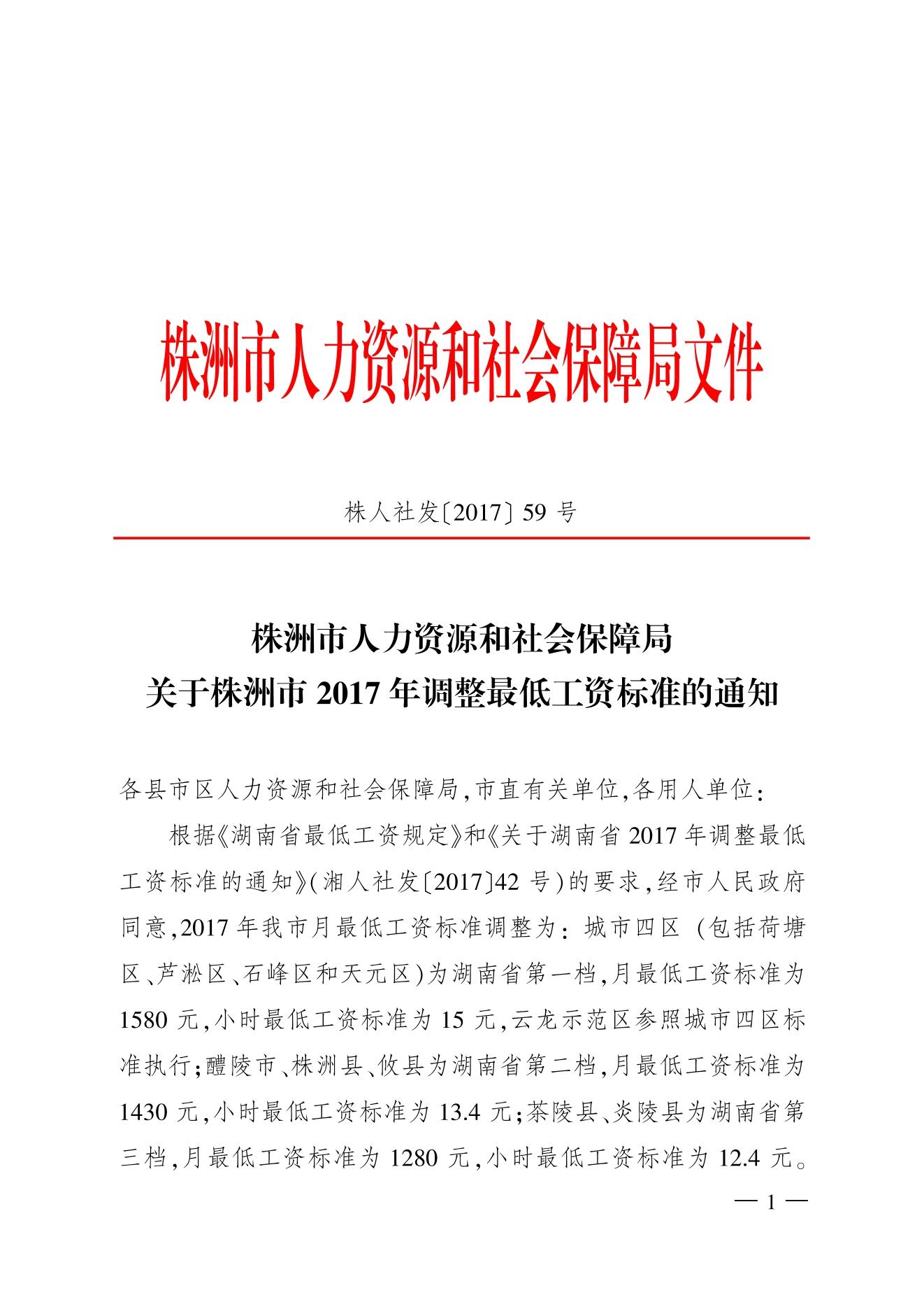 关于株洲市2017年调整最低工资标准的通知