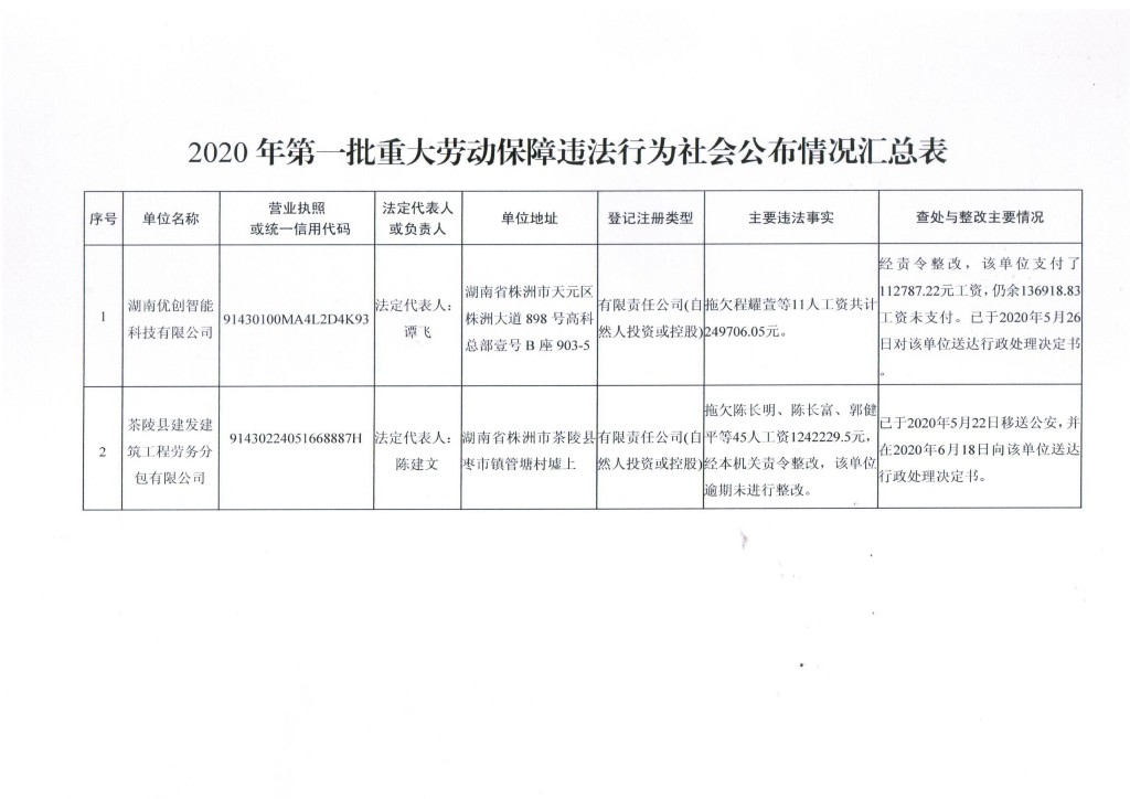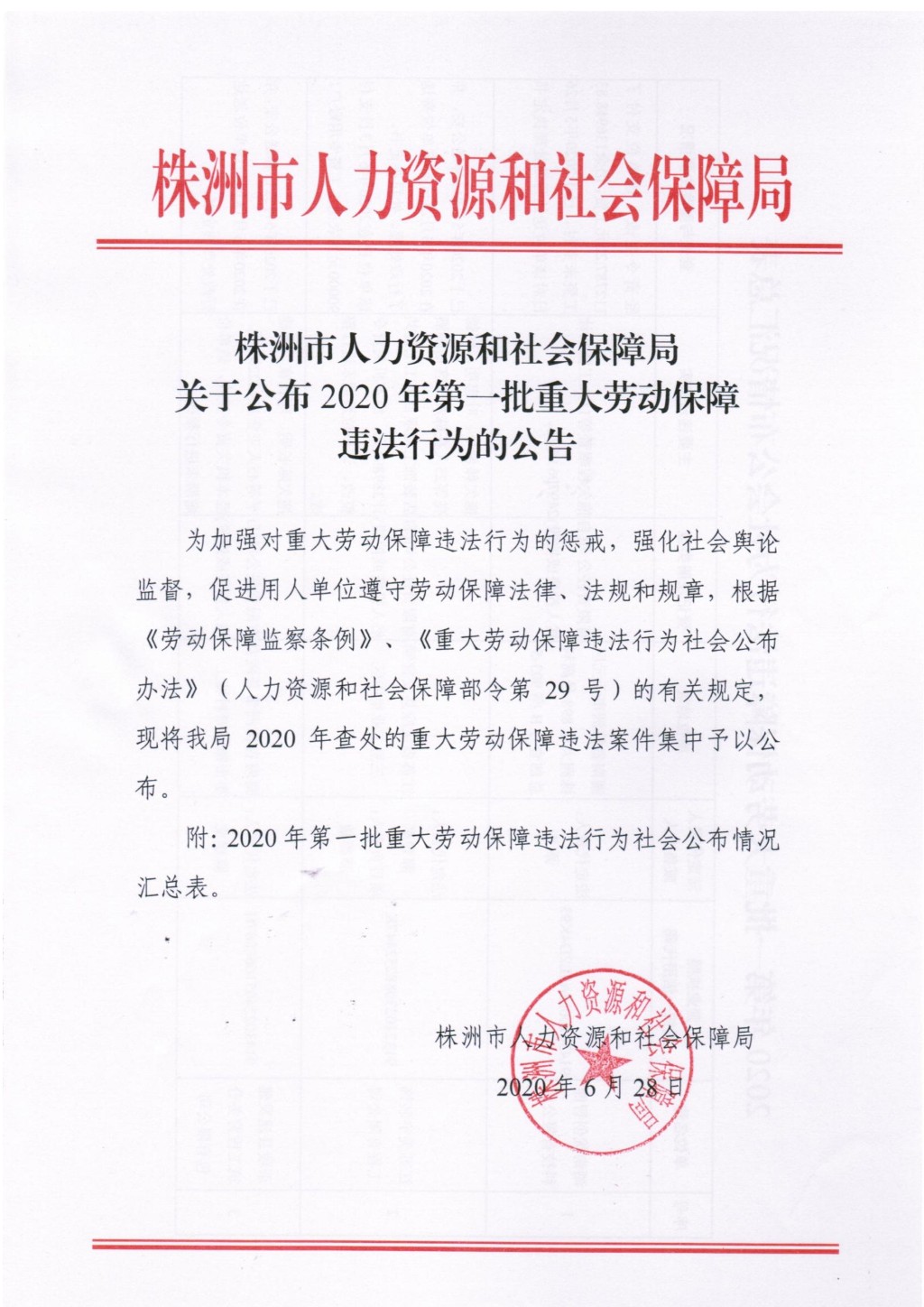 关于公布2020年第一批重大劳动保障违法行为的公告