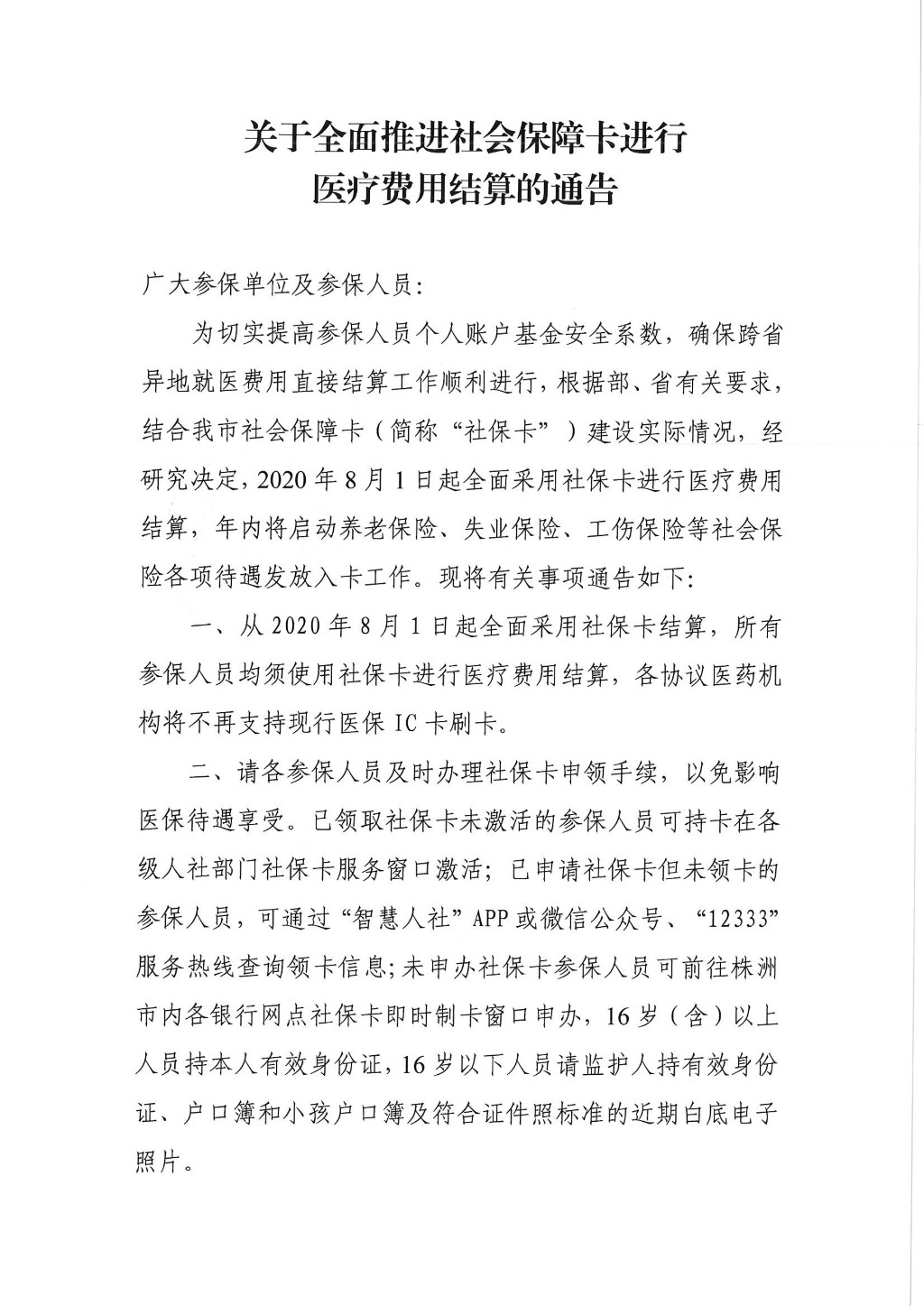 关于全面推进社会保障卡进行医疗费用结算的通告