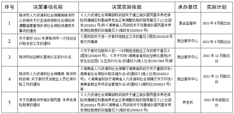 2021年度株洲市人力资源和社会保障局重大行政决策事项目录