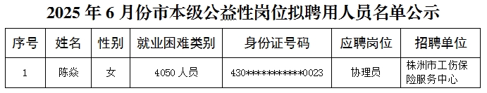 株洲市本级公益性岗位6月份拟聘用人员名单公示