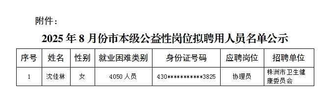 株洲市本级公益性岗位8月份拟聘用人员名单公示