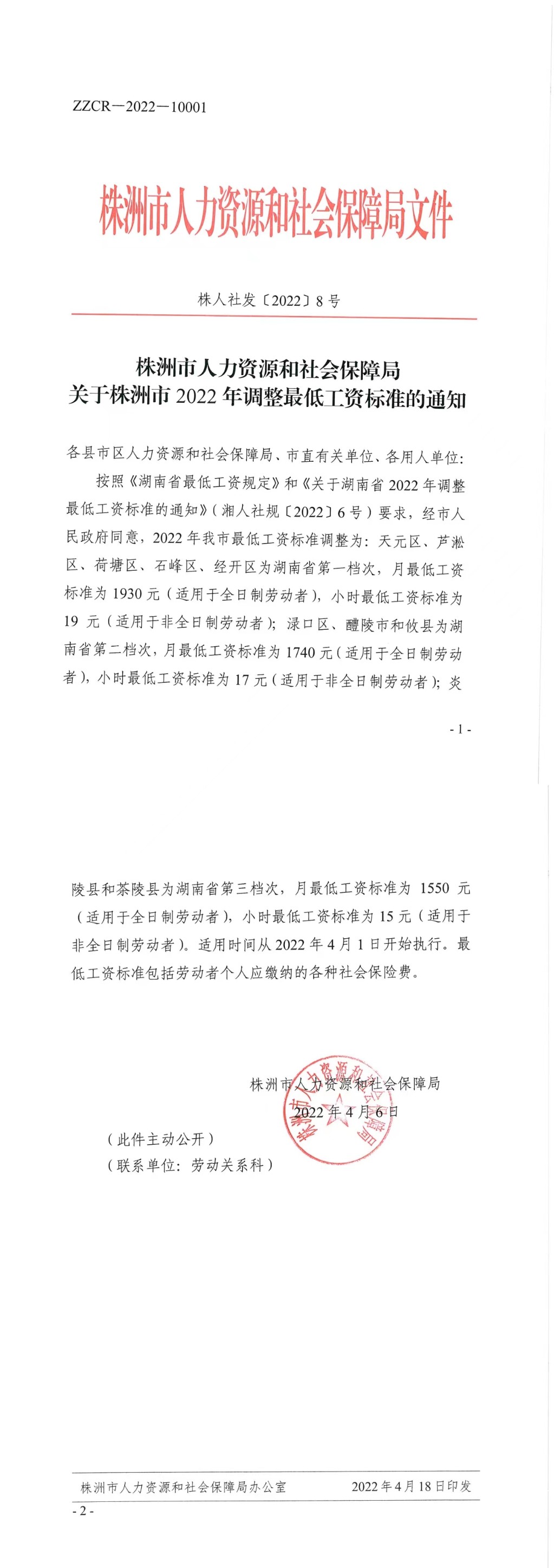 关于株洲市2022年调整最低工资标准的通知