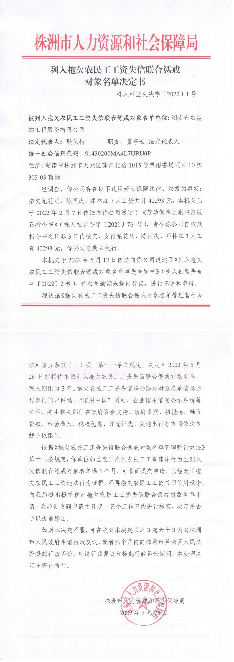 列入拖欠农民工工资失信联合惩戒对象名单决定书(株人社监失决字〔2022〕1号)