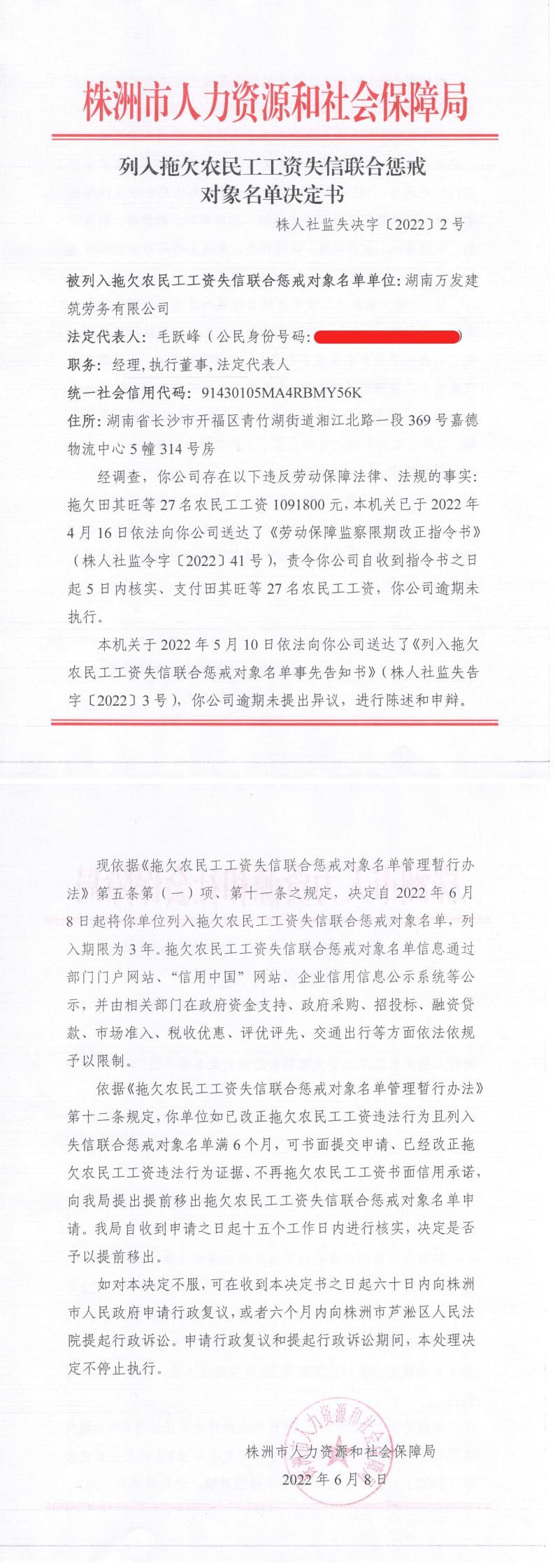 列入拖欠农民工工资失信联合惩戒对象名单决定书(株人社监失决字〔2022〕2号)