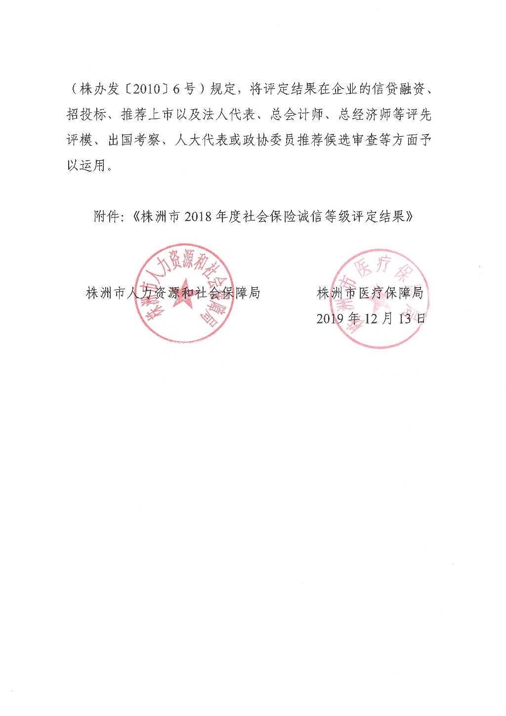 关于株洲市2018年度社会保险诚信等级评定结果的通报